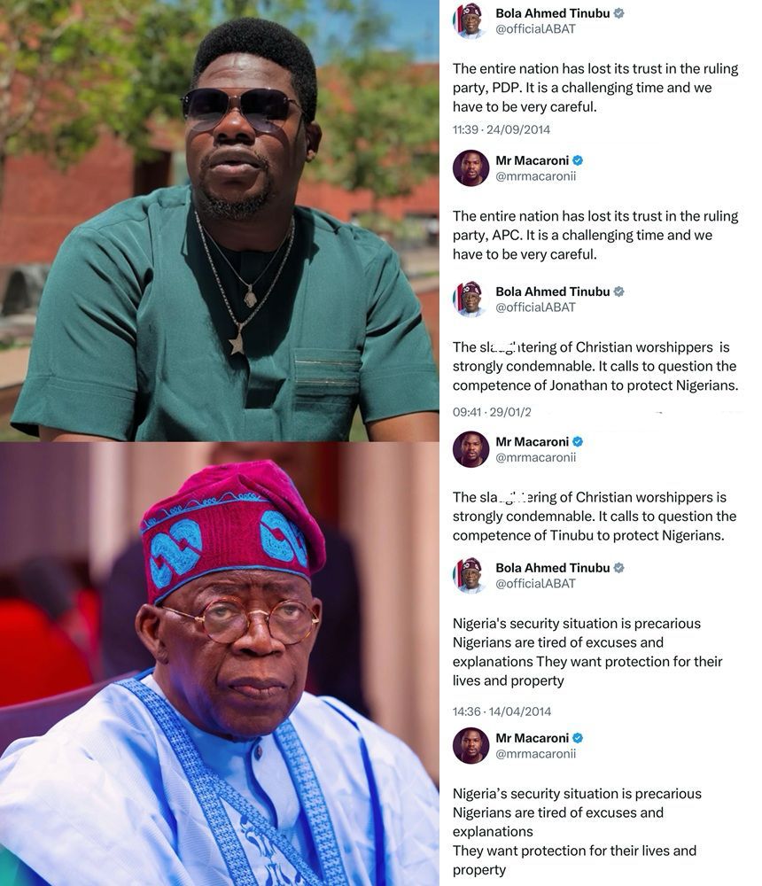 Mr Macaroni Claps Back at Tinubu Using His Own Tweets: \"What Goes Around, Comes Around\"