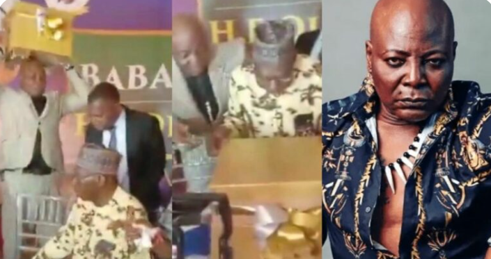 Village Boy Style: Charly Boy Stuns Guests as He Balances Giant Gift Box on His Head for Obasanjo’s 89th Birthday