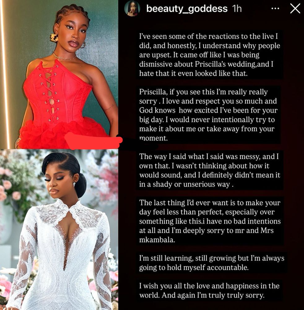 The world of social media was set ablaze earlier today after popular Nigerian influencer, Beauty Goddess, publicly apologized to fellow influencer and actress Priscilla Ojo for comments that appeared ...